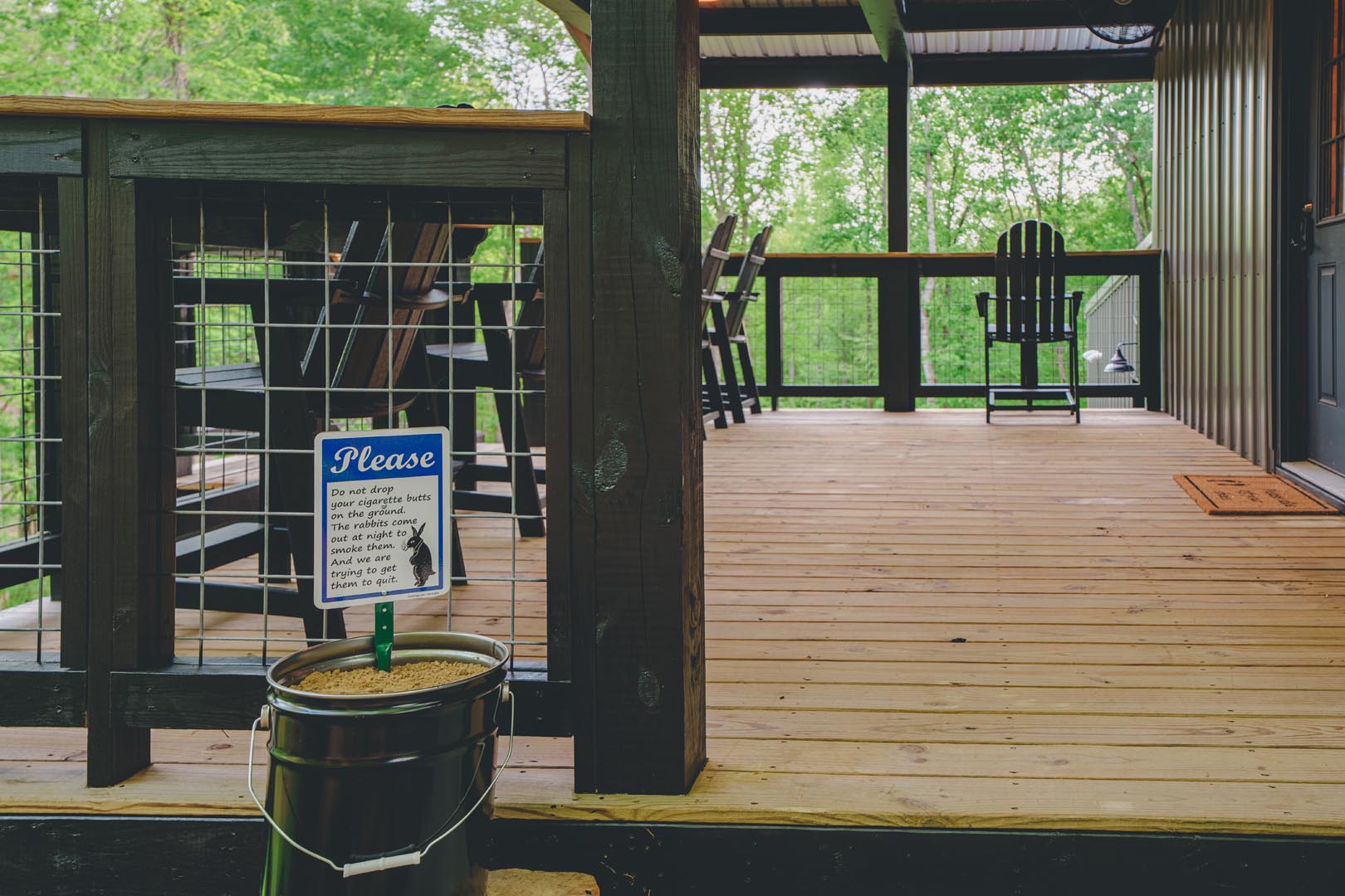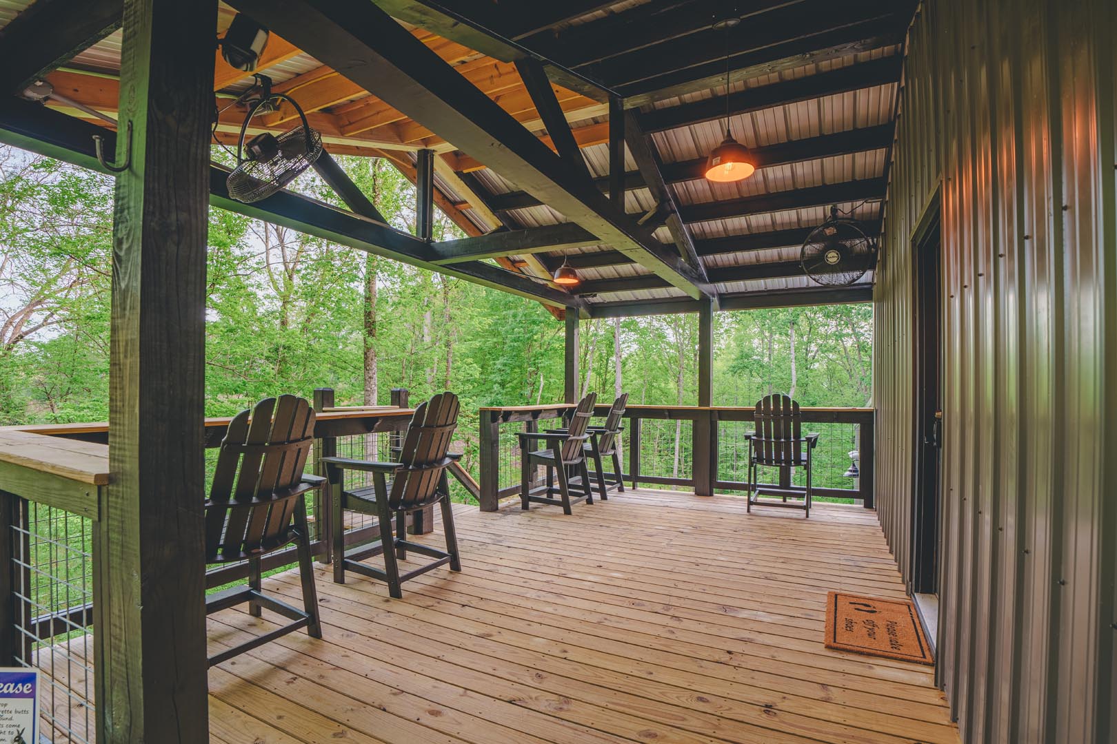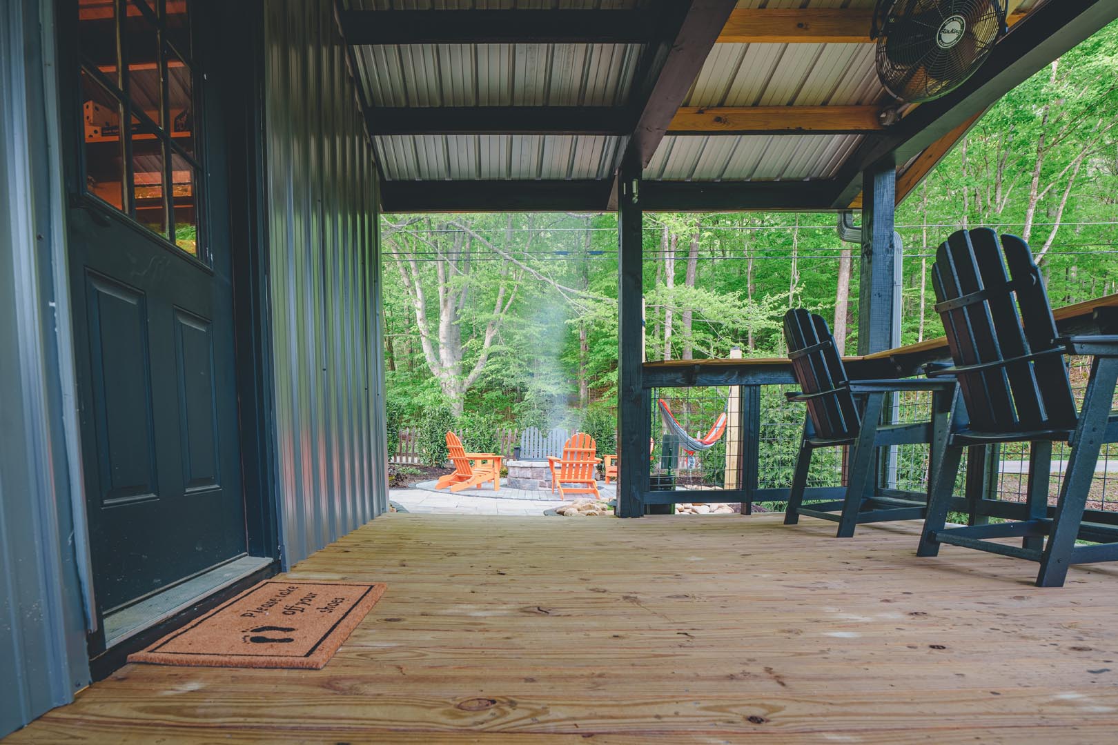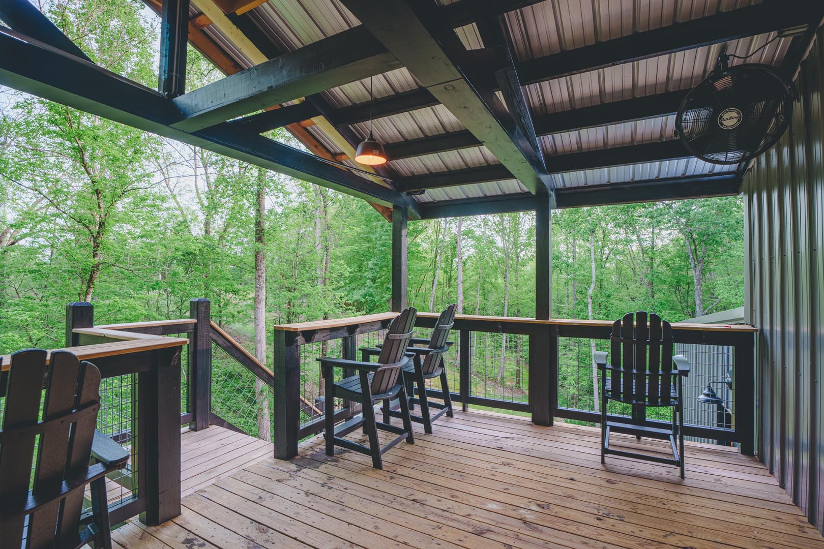 COVERED DECK: Bar-height deck chairs and wide railing for relaxing and watching the disc golf game (bring your own discs). Conveniently located to interact with your friends who are hanging out at the fire pit or in the dining room.