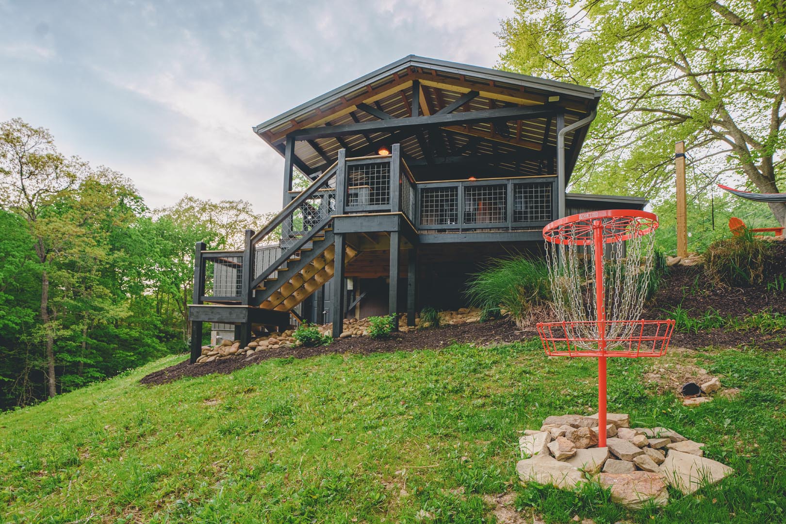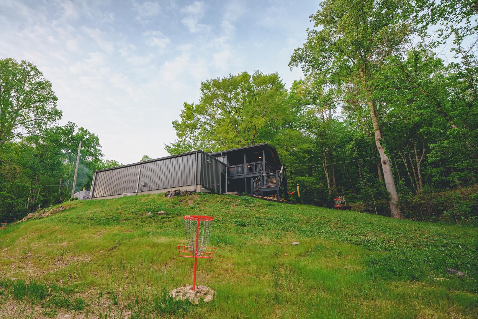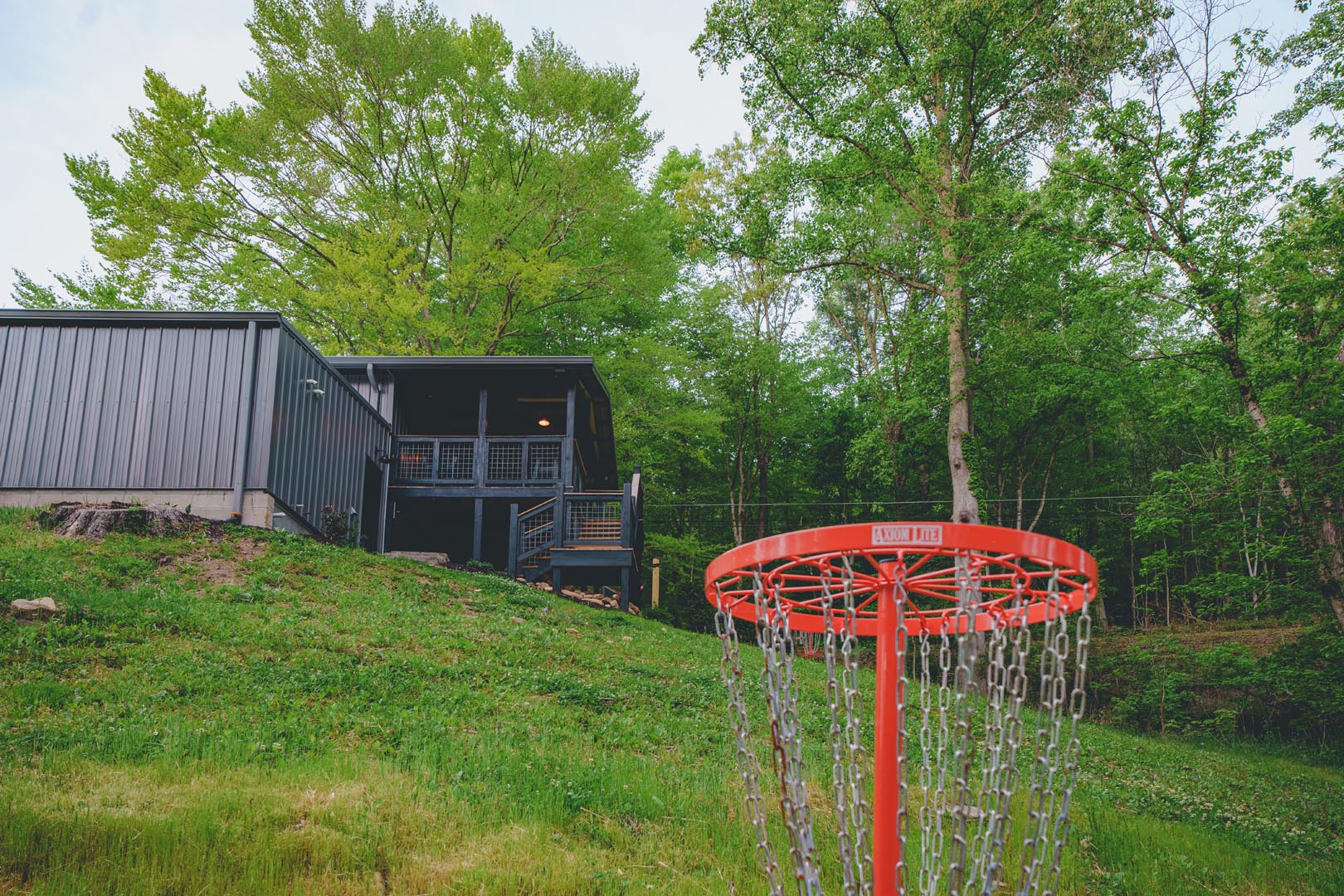 - A covered deck with bar seating for prime disc golf course spectating (bring your own discs!)